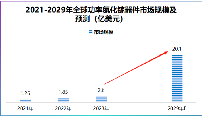 2021年全球功率氮化镓器件市场规模为1.26亿美元,预计随着新能源汽车的渗透,到2029年将达到20.1亿美元,又是一高成长领域。