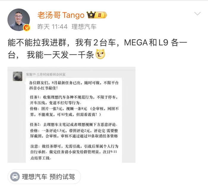 8月6日,理想汽车产品负责人汤靖晒出一张网络水军组织抹黑理想汽车的兼职群聊天截图,并调侃称:“能不能拉我进群,我有2台车,MEGA和L9各一台,我能一天发一千条。”