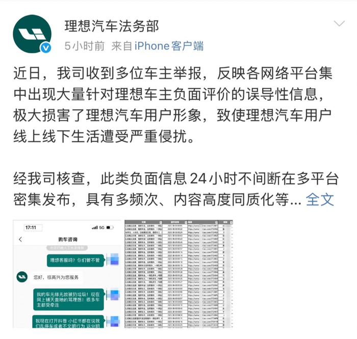 今日,理想汽车法务部发布消息表示:近日,我司收到多位车主举报,反映各网络平台集中出现大量针对理想车主负面评价的误导性信息,对此,我司警告背后黑手,我司正在固定相关证据,将坚决通过平台投诉、发起民事诉讼、刑事报案等一切法律途径追究其法律责任,维护广大用户和我司合法权益。