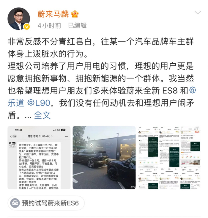 蔚来高管也来了,蔚来品牌与传播助理副总裁马麟发文称:非常反感不分青红皂白,往某一个汽车品牌车主群体身上泼脏水的行为。近期理想受到攻击,有人把祸水往蔚来身上引,如果理想用户朋友们信以为真,那就正中攻击者下怀了,请理想用户朋友们擦亮眼睛,避免被利用。同时建议理想尽快报警。