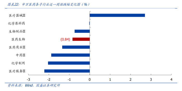 子行业方面,当周表现最好的为医疗器械II,环比+2.70%;表现最差的为医疗服务II,环比-2.22%。