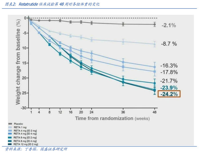 替尔泊肽整体较好的减肥效果带动了行业对于多靶点的看好,礼来进一步推进了GLP-1三靶点药物Retatrutide(GLP-1/GIP/GCGR)。在减重效果上更近一步,在48周时,12mg组降低体重24.2%。