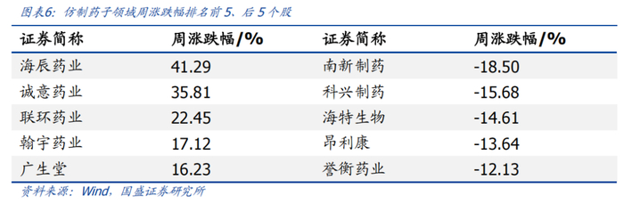 当周(8.4-8.8)涨跌幅排名前5为达仁堂、中恒集团、华润三九、吉林敖东、粤万年青。后5为奇正藏药、华森制药、新光药业、振东制药、佛慈制药。