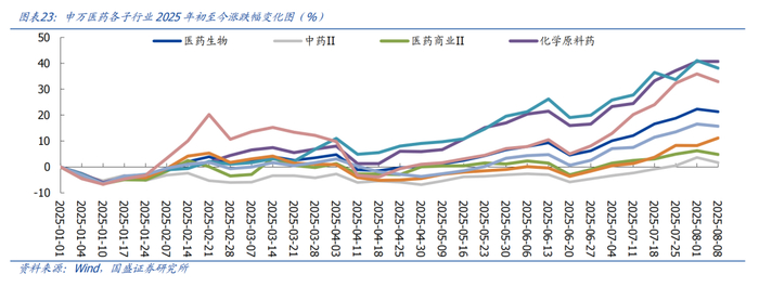 化学原料药年度涨跌幅行业内领先。2025年初至今表现最好的子行业为化学原料药,上涨40.66 %;表现最差的为中药II,上涨1.68 %。其他子行业中,化学制剂较年初+38.15 %,医疗服务II较年初+32.87 %,生物制品II较年初+15.68 %,医疗器械II较年初+11.16 %,医药商业II较年初+4.81 %。