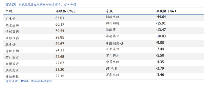 滚动月涨跌幅排名前5为广生堂、热景生物、博瑞医药、禾信仪器、康希诺。后5为锦波生物、神州细胞、浩欧博、永安药业、泽璟制药-U。