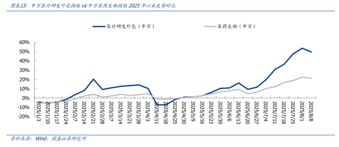 当周(8.4-8.8),申万医疗研发外包指数(-3.56%)跑输申万医药生物指数(-0.84%)2.72pct,2025年初至今申万医疗研发外包指数(+48.07%)跑赢申万医药生物指数(+21.28%)26.78pcts。