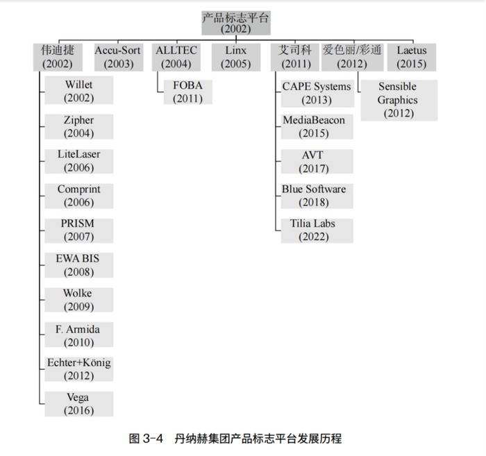 产品标志平台的建立是从2002年以4亿美元并购基石资产伟迪捷和1.1亿美元并购英国Willet开始的(见图 3-4)。之后在 2005 年,丹纳赫集团以 1.6 亿美元并购了 Linx,2011 年以 4.7 亿美元并购了艾司科,2012 年以 6.3亿美元并购了爱色丽(X-Rite)和彩通业务,扩展到了产品包装设计、管理和制作的全链条。2023 年,该平台和水质平台一起被分拆进入 Veralto,在丹纳赫集团度过了非常成功的 21 年。
