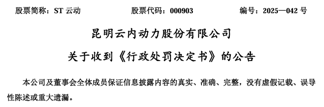 8月9日,昆明云内动力股份有限公司(ST云动,000903)披露关于收到《行政处罚决定书》的公告。