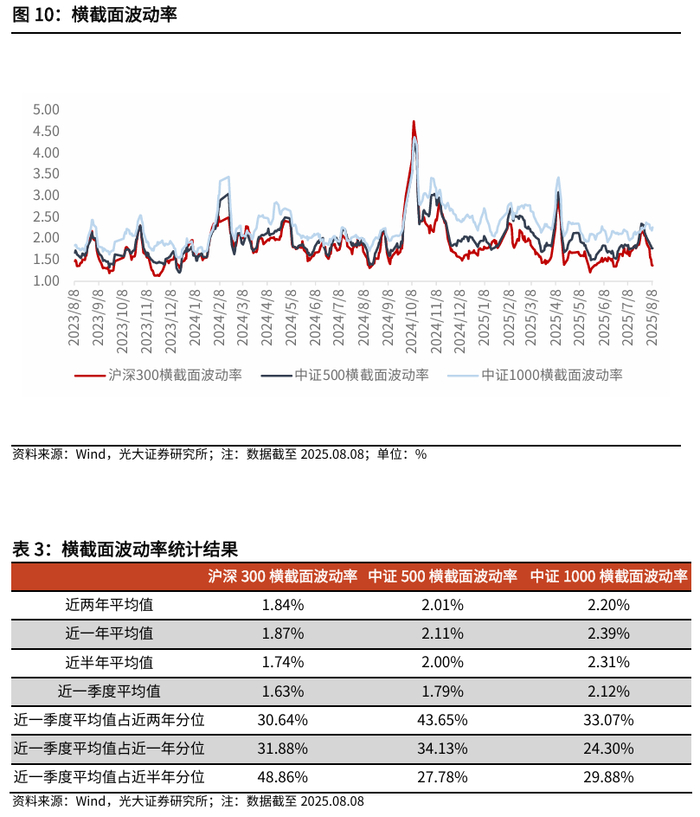 截面波动率来看,最近一周沪深300、中证500、中证1000指数成分股横截面波动率环比前一周下降,短期Alpha环境减弱。