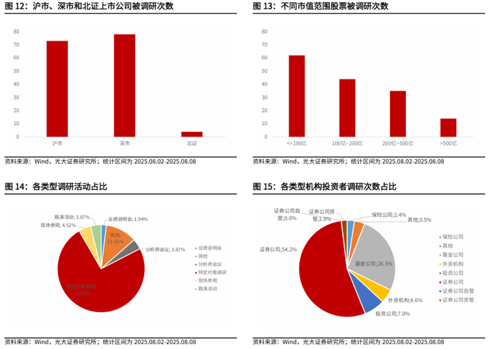 从调研类型来看,特定对象调研和其他为本周主要调研类型,占比分别为74.19%和11.61%。从机构类型来看,投资公司、基金公司和证券公司的调研次数占比依次为7.0%、26.3%和54.2%。
