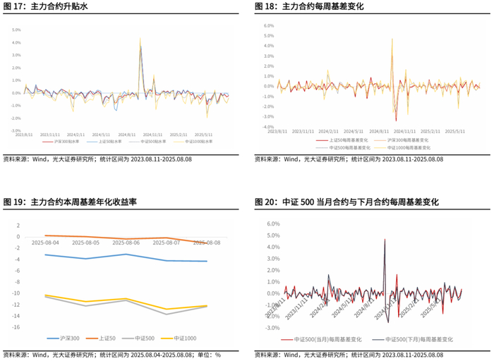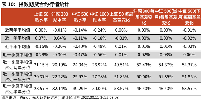 本周除上证50外,沪深300、中证500、中证1000指数期货主力合约贴水率环比前一交易周上升。IF当月合约近一季度平均每周基差变化0.02%,相比于近半年的0.01%环境变好。IH当月合约近一季度平均每周基差变化0.01%,相比于近半年的0.01%环境不变。IC当月合约近一季度平均每周基差变化0.03%,相比于近半年的0.01%环境变好。