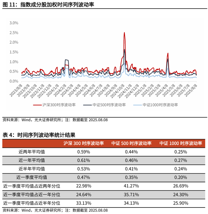 时间序列上来看,最近一周沪深300、中证500、中证1000指数成分股时间序列波动率环比前一周下降,Alpha环境减弱。