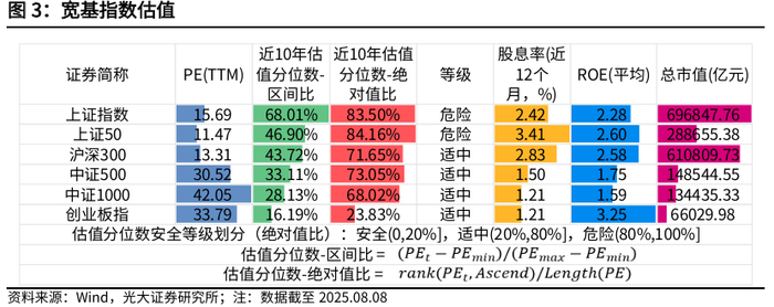 截至2025年8月8日,宽基指数来看,沪深300、中证500、中证1000、创业板指处于估值分位数“适中”等级,上证指数、上证50处于估值分位数“危险”等级。