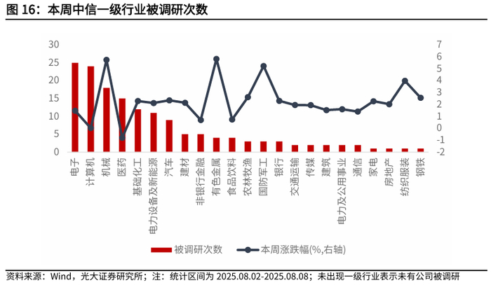 从中信一级行业来看,本周电子、计算机和机械行业被调研次数较多,本周涨跌幅依次为1.48%、0.03%和5.75%。
