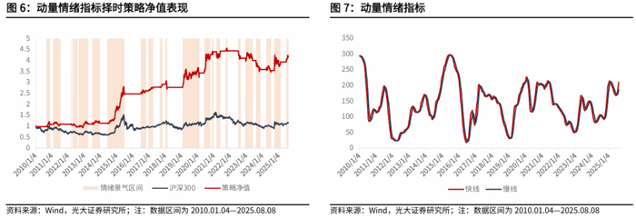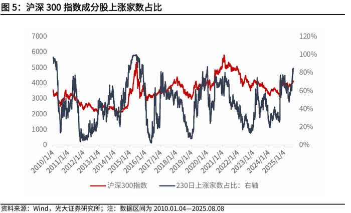 我们发现,该指标可以较快捕捉上涨机会;同时,由于选择在市场过热阶段提前止盈离场,也会错失市场持续亢奋阶段的上涨收益。指标在对下跌市场的判断也存在缺陷,难以有效规避下跌风险。截至2025年8月8日,该指标最近一周上升,上涨家数占比指标目前高于80%,市场情绪高涨。