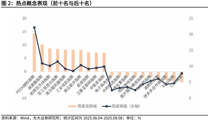 从热点概念来看,本周概念指数中表现最好的前5大概念依次为PEEK材料指数、减速器指数、射频及天线指数、军工信息化指数、液冷服务器指数;表现最差的5大概念依次为CRO指数、Kimi指数、拼多多合作商指数、减肥药指数、创新药指数。