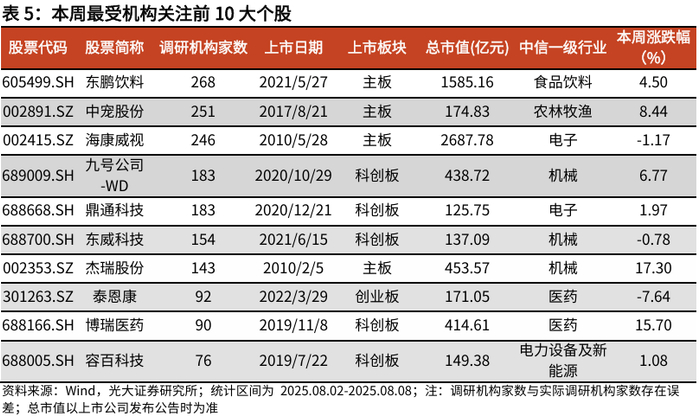 从个股来看,本周受到机构关注程度最高的前5大个股依次为东鹏饮料(268家)、中宠股份(251家)、海康威视(246家)、九号公司-WD(183家)和鼎通科技(183家)。