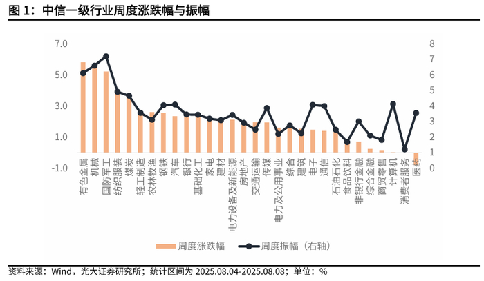 从中信一级行业来看,本周涨幅最高的前5大行业依次为有色金属、机械、国防军工、纺织服装、煤炭;中信一级行业中振幅最高的前5大行业依次为国防军工、机械、有色金属、纺织服装、煤炭。