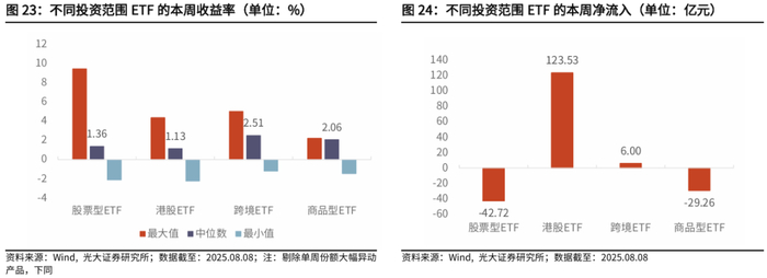 股票型ETF本周收益中位数为1.36%,资金净流出42.72亿元。港股ETF本周收益中位数为1.13%,资金净流入123.53亿元。跨境ETF本周收益中位数为2.51%,资金净流入6.00亿元。商品型ETF本周收益中位数为2.06%,资金净流出29.26亿元。