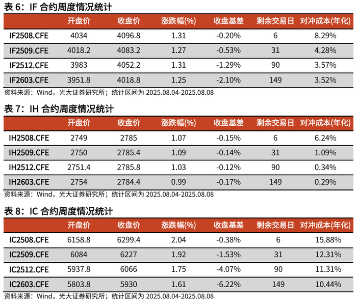 本周IF当月合约上涨1.31 %,收于4096.8,收盘基差-0.20%;IH当月合约上涨1.07 %,收于2785,收盘基差-0.15%;IC当月合约上涨2.04 %,收于6299.4,收盘基差-0.38%;IM当月合约上涨2.79 %,收于6810.2,收盘基差-0.41%。