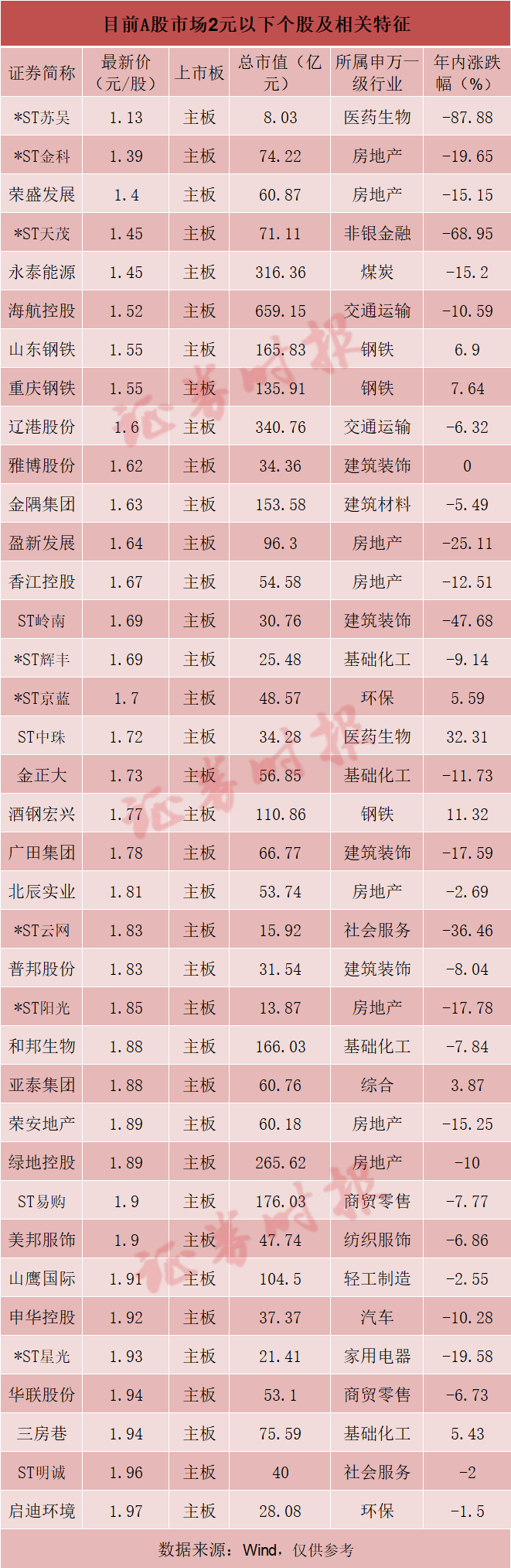 目前低价股群体现状如何?记者根据Wind数据统计发现,目前37只股价低于2元的股票中,股价最低的是*ST苏吴,最新股价仅为1.13元/股。