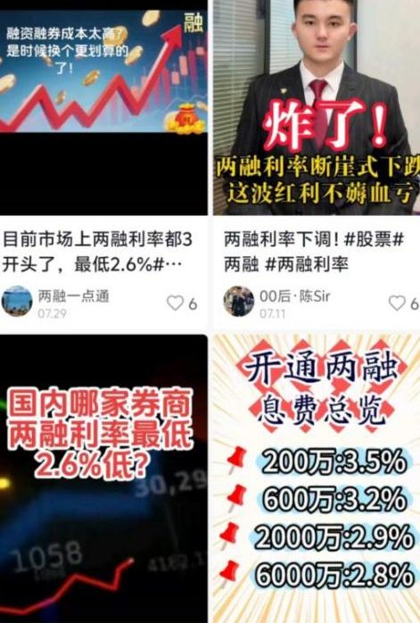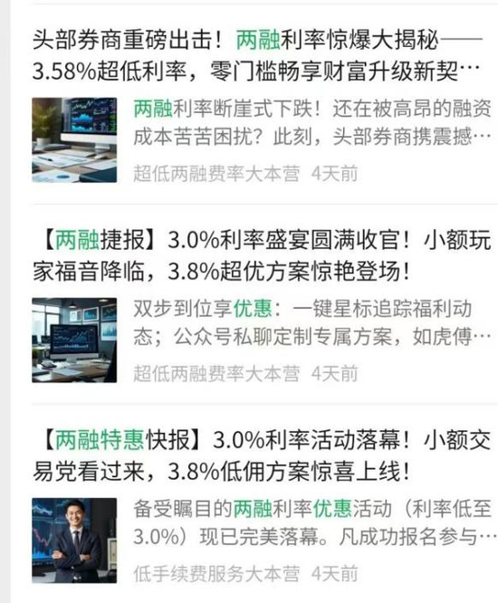 每当市场对两融预期向好之时,就有券商下调两融利率的传言。近期,网络平台涌现了一批通过低融资利率招揽客户的帖子,以“3.58%超低利率,零门槛畅享”“头部券商,两融利率最低可到3%”“两融利率断崖式下跌”等宣传语吸引眼球。