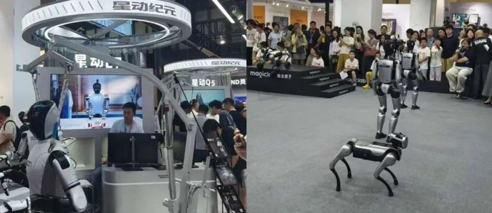 展区热闹非凡:宇树科技的格斗赛人头攒动、众擎机器人穿着“钢铁侠”涂装走秀……吸睛场面比比皆是。