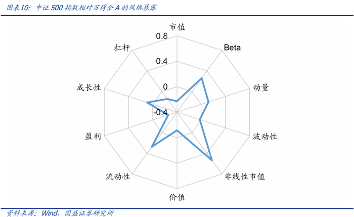中证500指数当前相对万得全A的风格总体为中市值、高流动性、高Beta。中证500指数当前在非线性市值、流动性、Beta、动量、成长性等风格因子上的正向暴露较多,在盈利、市值、杠杆、价值、波动性等因子上负向暴露较多。因此,指数目前相对于万得全A来说整体上的风格特征可总结为中市值、高流动性、高Beta。