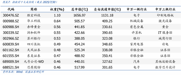 指数成分股的分散度较高。指数成分股数量较多,截至2025年7月30日,前十大成份股的累计权重仅为5.75%,个股权重分布较分散。从指数前十大成分股来看,持仓权重最大的5只股票分别为胜宏科技、华工科技、赤峰黄金、润和软件、苏州银行。