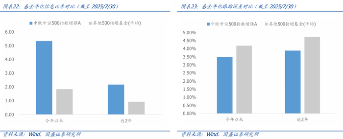 相比同类产品,中欧中证500指数增强基金的信息比率更高,跟踪误差更小。不论是从近2年长期维度来看,还是从短期今年以来维度来看,中欧中证500指数增强基金的信息比率和跟踪误差等指标都优于其他同类500增强基金。