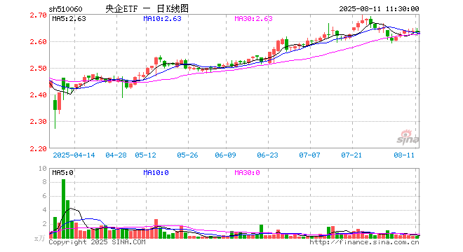 8月11日,截止午间收盘,央企ETF(510060)跌0.27%,报2.630元,成交额59.51万元。央企ETF(510060)重仓股方面,招商银行截止午盘跌0.40%,长江电力跌0.65%,交通银行跌0.65%,中信证券涨2.18%,农业银行涨0.89%,中芯国际涨0.48%,京沪高铁涨0.00%,光大银行跌1.45%,中国银行跌0.71%。