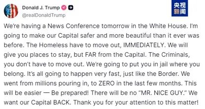 发出此言的是美国总统特朗普。据央视新闻、中新社等报道,当地时间8月9日,特朗普在其“真实社交”平台发帖称,白宫将于本月11日举行一场新闻发布会,旨在从根本上遏制首都华盛顿特区的暴力犯罪。