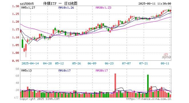 8月11日,截止午间收盘,传媒ETF(159805)涨0.87%,报1.274元,成交额1017.37万元。传媒ETF(159805)重仓股方面,分众传媒截止午盘涨5.36%,恺英网络涨0.00%,岩山科技涨1.03%,巨人网络跌2.15%,光线传媒跌3.73%,昆仑万维涨1.61%,三七互娱涨0.35%,利欧股份涨3.66%,蓝色光标跌0.86%,神州泰岳涨0.31%。