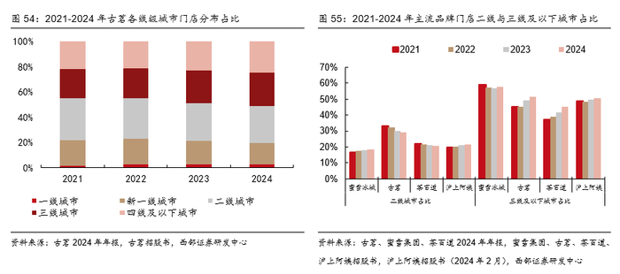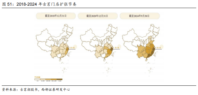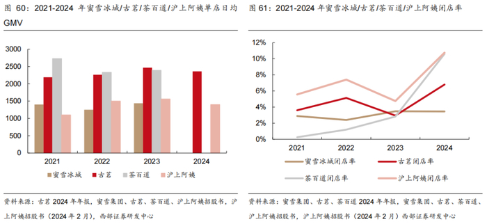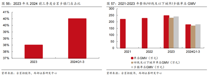 二线城市门店占比领先,乡镇门店占比持续提升。2024年蜜雪/古茗/茶百道/沪上门店二线城市占比分别为18%/29%/20%/21%,三线及以下城市占比分别为57%/51%/45%/50%,成为二线及以下城市门店占比最高的品牌。另外,2024年前三季度公司乡镇门店占比已达40%。2023年古茗整体/四线及以下/乡镇单店GMV分别为247/230/240万元,2024Q1-3为178/170/180万元,乡镇单店GMV接近甚至高于整体。