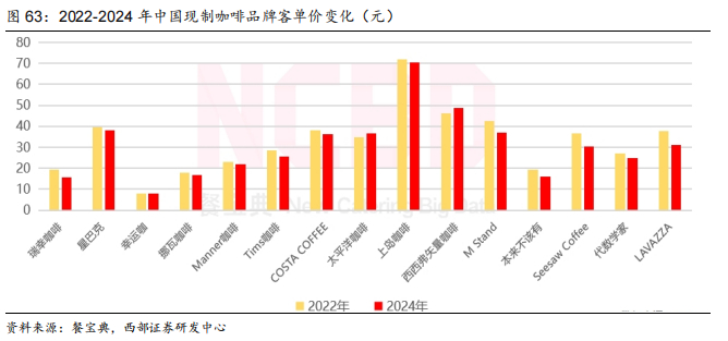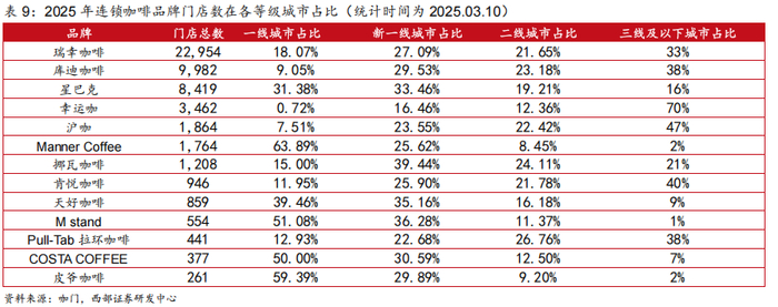 咖啡品牌持续内卷,下沉市场为必争之地。根据NCBD,2024年我国现制咖啡品牌客单价较2022年均有不同幅度的下降,一方面源于库迪与瑞幸低价咖啡竞争,另一方面随着消费者教育不断深入,咖啡从过去社交属性强、品牌附加值较高的现制饮品,逐步成为日常消费属性较强、强调产品本身口味与提神功能的产品,利于行业持续扩容。另外,头部咖啡品牌亦持续在下沉市场中寻找增量。