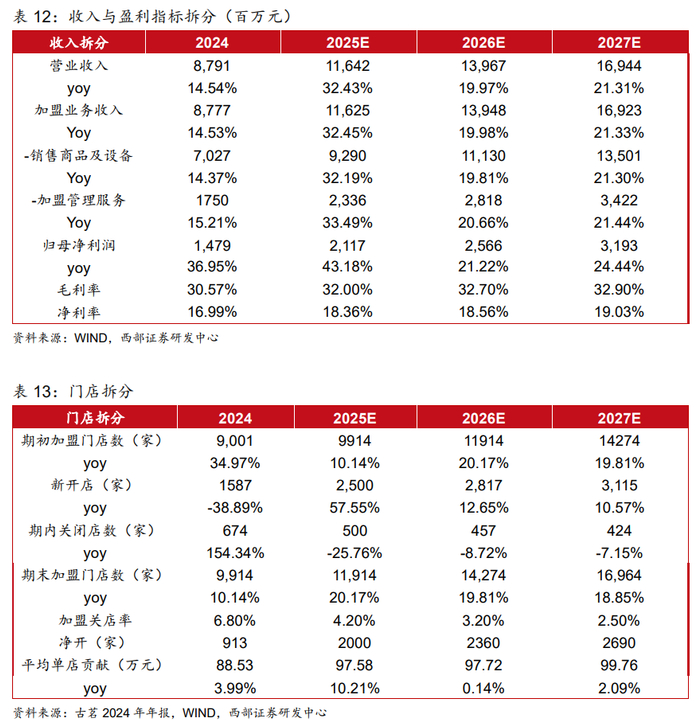 关键假设1:门店扩张方面,我们认为公司在去年低基数开店表现基础上,今年及后续净开店数量预计实现前一年门店数量的20%左右,预计公司2025/2026/2027年净开店数量分别为2000/2360/2690家;期末加盟门店数量分别为11914/14274/16964家,同比增速分别为20.17%/19.81%/18.85%。单店贡献方面,我们认为公司今年受益于外卖补贴与咖啡品类扩大覆盖面,单店贡献预计实现双位数增长;明后年分别实现持平与个位数增长,预计2025/2026/2027年平均单店贡献同比增长分别为10.21%/0.14%/2.09%。