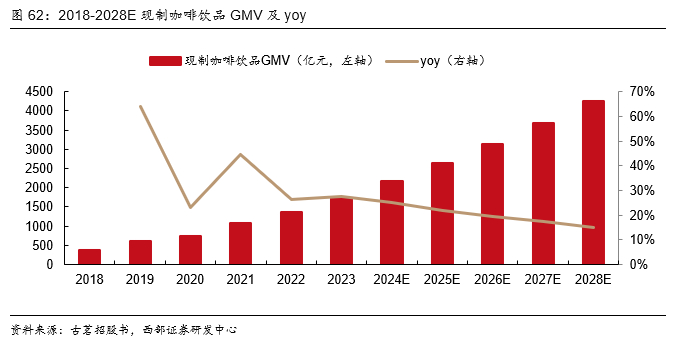 现制咖啡饮用销售额持续提高,消费者对咖啡本身口味要求提升。2025年我国现制咖啡饮品GMV预计达2625亿元,同增22%,2021-2025CAGR为25%。