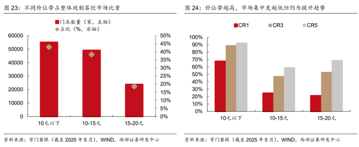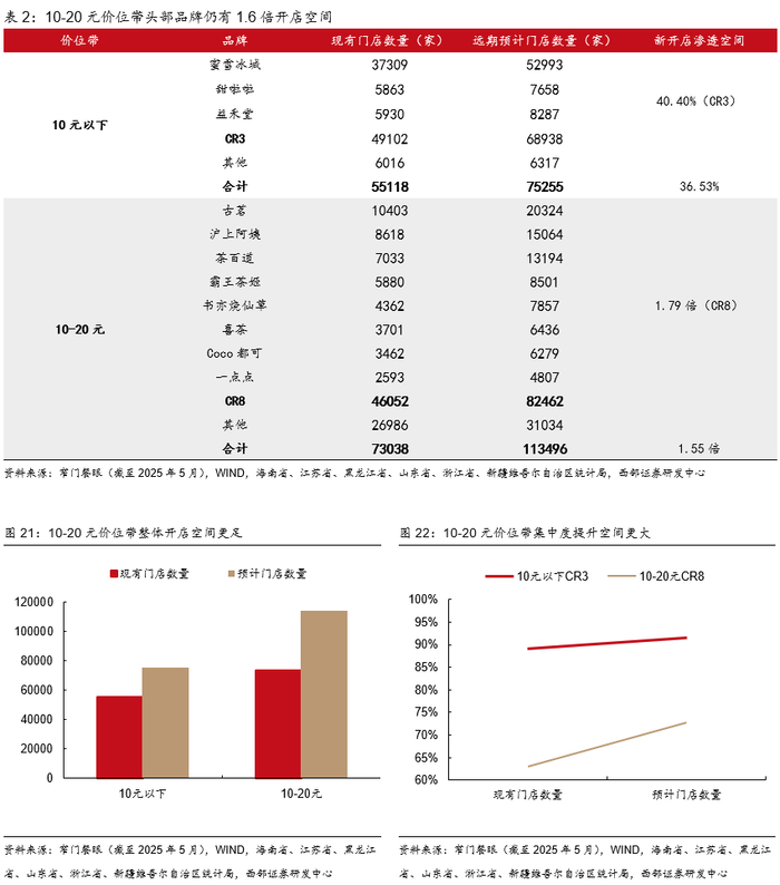 10元以下价位带仍具约36%开店空间,头部集中效应明显。10元以下价位带拥有5000家以上门店的品牌仅蜜雪冰城、甜啦啦、益禾堂三家,CR3达89%,其中蜜雪冰城以3.7w家门店占据龙头地位;我们测算远期该价位带总门店数预计为7.5w家,其中CR3近7w家。10-20元价位带开店空间为1.55倍,龙头集中度具备提升空间。目前门店超过2000家的品牌CR8仅63%,我们测算远期该价位带总门店数预计为11.3w家,其中CR8近8.3w家,占比73%。