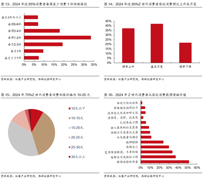 茶饮消费单价低频次高满足情绪价值,强可选属性支撑千亿赛道。2024年近65%的消费者每周至少消费1杯现制茶饮,其中超过30%的消费者每周消费杯数超过3杯,显现出当下消费者对茶饮的旺盛需求;同时,10-20元为Z世代奶茶消费的主要价格区间,覆盖该群体奶茶消费价位75%的比重;且Z世代2024年在茶饮消费频次上总体呈现上升趋势,从茶饮消费中获取情绪价值的消费理由占36.9%。