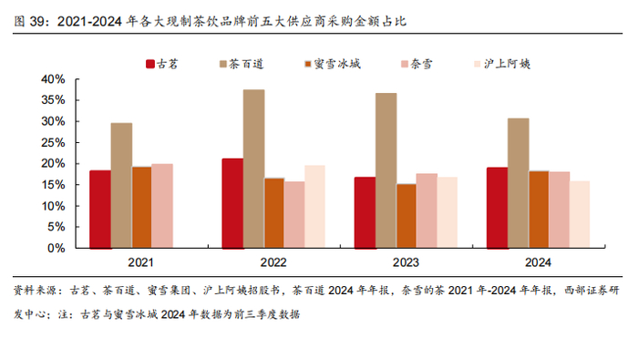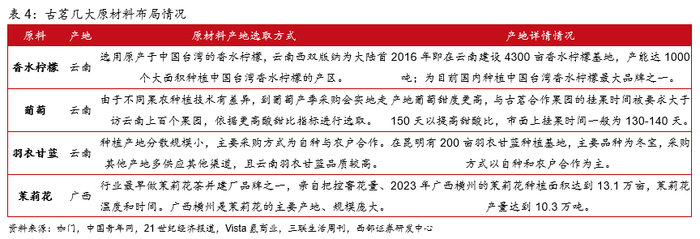部分原料自建产地,保证原料品质同时成本控制力强。2021-2024年前三季度古茗前五大供应商采购金额占比保持在16-21%,2023年采购36个品种约8.5万吨的新鲜水果,大规模采购利于压低成本同时保持长期稳定的品质,2023年向门店供应芒果的价格较市价低30%。另外,公司积极布局上游原材料产地自建,目前已拥有中国台湾香水柠檬全国最大面积种植基地之一。