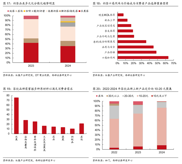 消费者偏好多元化叠加高性价比需求,对茶饮品牌供应链与响应速度提出高要求。2024年产品品类呈现多元趋势,多样奶茶品类不断出现。另外,当下茶饮新品注重对不同原料的应用,水果、谷物、香料、坚果等原料均在10种及以上的新品中得到使用。同时在当下新品价格分布上,10-20元价位区间中的新品占比逐年上升,2024年达到78.1%。