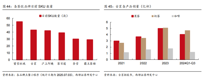 采取“货架式”产品策略,满足消费者多样需求。在“每天一杯喝不腻”的产品口号下,古茗致力于为消费者提供新鲜美味、口味一致、价格亲民的高质量产品组合,目前拥有43款SKU,仅低于蜜雪冰城,产品价格主要区间在10-15元价位带。目前产品可分为果茶、奶茶、咖啡三类,截至2024Q3三大品类出杯数量占比分别为41%/47%/12%,2023年“云雾栀子”轻乳茶的推出拉动奶茶品类销量迅速提升。