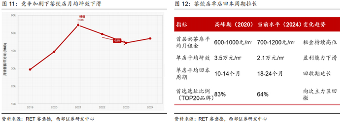 茶饮行业加密开店加剧竞争,单店回本周期拉长。目前茶饮店单店平均回本周期达18-24M,较2020年高峰期拉长8-10个月不等,各茶饮品牌通过选择性价比较高的点位及加大加盟政策优惠力度等方式,减少单店投入成本。