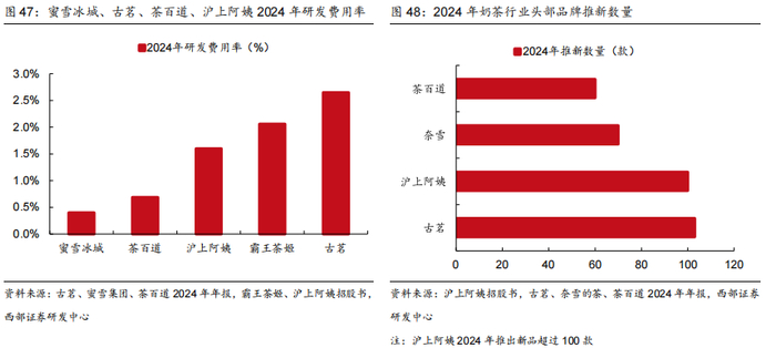 重视产品研发,产品推新数与复购率领先其他品牌。2024年古茗研发费用率达2.65%,高于其他头部茶饮品牌。公司研发团队共117人,包括美食家与工程师,前者激发产品灵感并追踪最新消费者偏好趋势;后者严格分析成分,从香气、酸度和甜度等方面量化不同原料的风味。截至2024Q3,通过这种方式积累超1000款不同种类或来自不同供应商的食材数据。产品研发力使得公司在推新数量实现领先,同时在强大供应链体系的加持下,同一价位带中产品品质更高,2023年公司季度产品复购率达50%+。