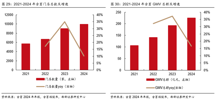 3)开店:区域加密策略下前8大关键规模省份门店数量占比近80%,聚焦攻坚形成根据地高市占率;下沉策略下加盟商单店 GMV 相对领先。