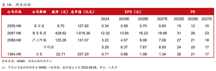 投资建议:我们认为古茗核心逻辑为:1)强战略定力与极致效率导向结合,筑就供应链&产品质价比&门店盈利稳定核心壁垒。2)中期看开店展望2w家+,有望成为10-15元领先龙头;咖啡品类提高客单量,供应链优势下快速布局。我们预计公司2025/2026/2027年收入分别为116/140/169亿元,归母净利润分别为21/26/32亿元,目前股价对应公司2025/2026/2027年PE分别为26X/21X/17X,我们选取目前已港股上市的所有现制茶饮标的蜜雪集团、茶百道、沪上阿姨为可比公司。考虑到公司目前处于区域加密的全国化扩张阶段,成长性强,首次覆盖,给予“买入”评级。