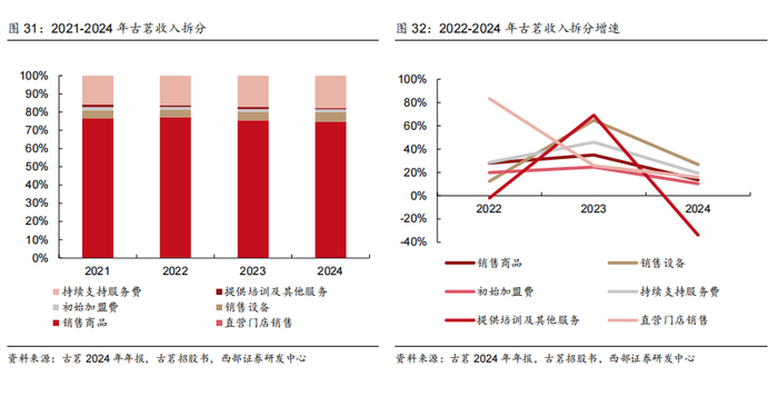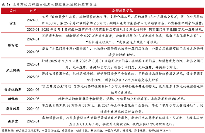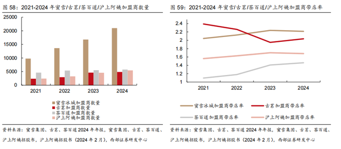 重视与加盟商共成长,加盟商带店率较高。2024年公司拥有4868位加盟商,老加盟商带店率为2.0,在头部茶饮品牌中位于较高水平;2022年以来有所下降主要系新加盟商不断加入所致。公司目前与早期核心加盟商仍维持密切关系,部分成为公司员工或顾问,帮助其扩张或发现问题,利于门店长期稳定经营。