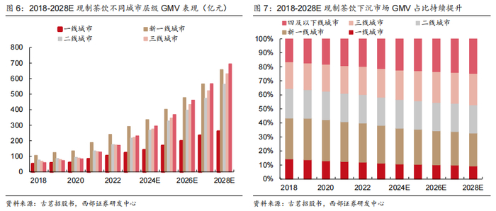 下沉市场需求引领行业增长,二线及以下城市市场 规模快速增长。分城市层级来看,2025年二线及以下城市现制茶饮GMV预计1043亿元,同增24%,占整体65%;2021-2025年二线以上/二线及以下城市现制茶饮GMV之CAGR分别为20%/28%。