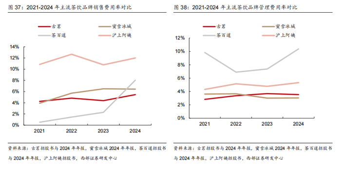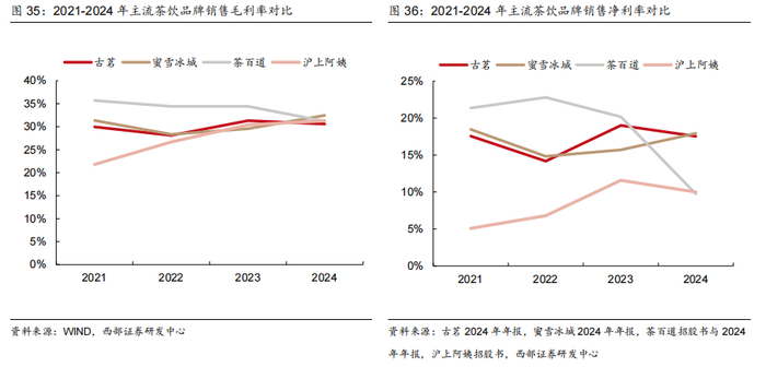 盈利能力仅次于蜜雪冰城,费用率处于较低水平。2024年蜜雪冰城/古茗/茶百道/沪上净利率为17.94%/17.54%/9.75%/10.00%,古茗净利率水平接近蜜雪,远高于其他茶饮品牌。拆解来看,各家毛利率水平相近均在30-35%左右,2024年行业竞争加剧下多数为下降态势,其中古茗表现相对稳健;另外销售与管理费用率均处于行业较低水平。