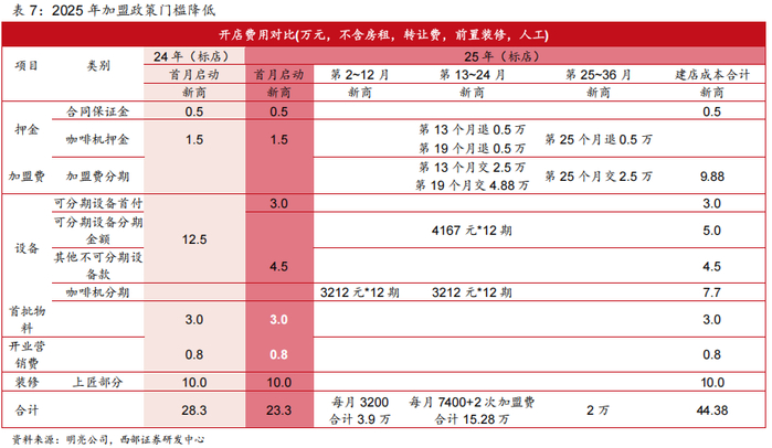 为减轻新商开店负担,同时平衡老商开新店成本,古茗今年推出力度较大加盟政策,包括:1)分期支付,加盟费及大型设备费可申请分三次支付。2)闭店回收,若门店提前关店,分期欠款无需再支付且按照折价估算二手回收其设备,优先内部转让。3)老商优惠,老加盟商在同一个商圈开第二家店,免加盟费;跨区域开免部分费用。对比此前28.3w的开店费用(不含房租、人工等成本),今年新商启动资金优惠5万元,单店模型优化。